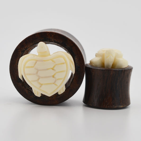 Turtle Design Organic Buffalo Bone, Double Flare Sono Wood Tunnel Plugs | Gauges