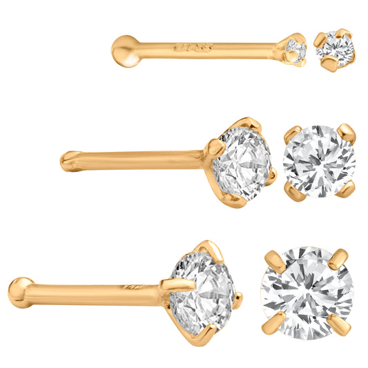 20g - 14k Solid Gold Round Cubic Zirconia Prong Setting Nose Ring Bone