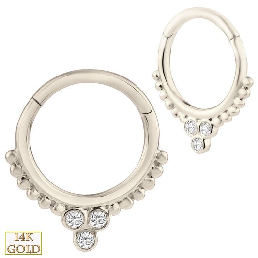 14k Solid Gold Beaded Design with Zircon Hinged Hoops