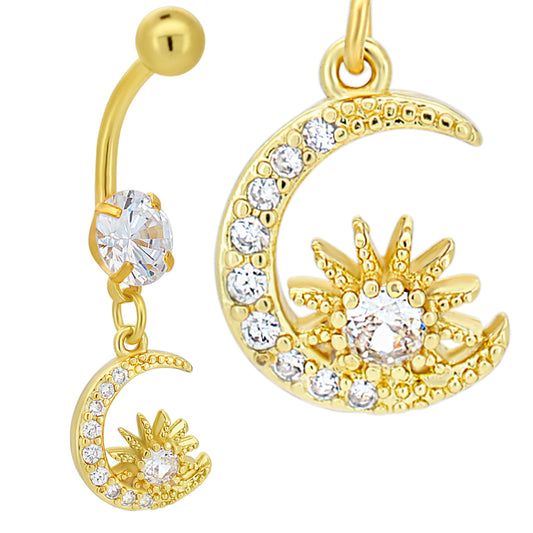 316L Stainless Steel Dangling Moon and Sun Zircon Design Belly Ring