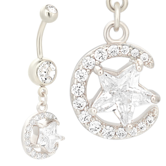 316L Stainless Steel Dangling Crescent Moon with Star and Zircon Design Belly Ring