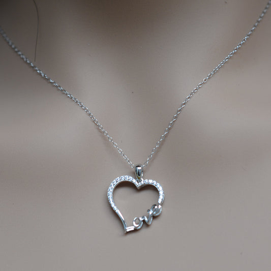 925 Sterling Silver CZ Studded Hollow Heart with LOVE word Pendant Necklace