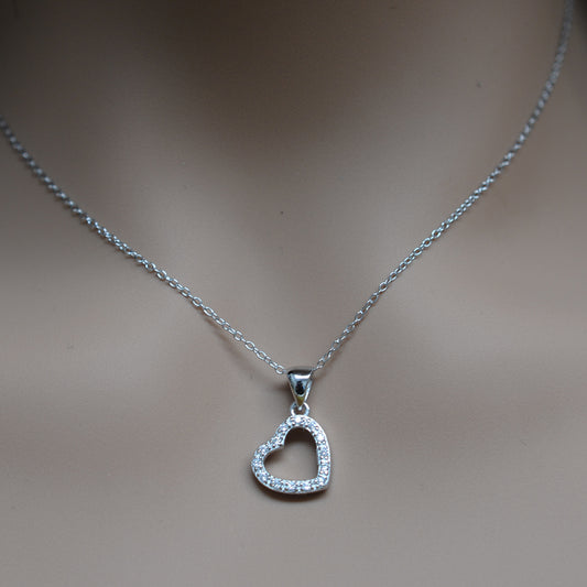 925 Sterling Silver Hanging Hollow Heart Studded with CZ Pendant Necklace
