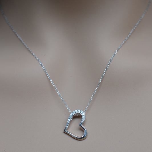 925 Sterling Silver Slanted Hollow Heart Half Studded with CZ Pendant Necklace