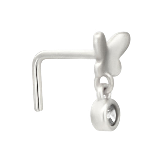 Sterling Silver Plain Butterfly with Dangling CZ L-Shaped Nose Ring