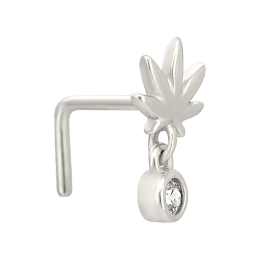 Sterling Silver Weed / Marijuana Leaf with Dangling CZ L-Shaped Nose Ring