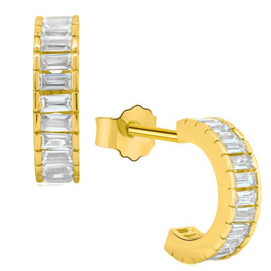 925 Sterling Silver Half Hoop Stud Earrings with Baguette Cubic Zirconia Earring Push Backing