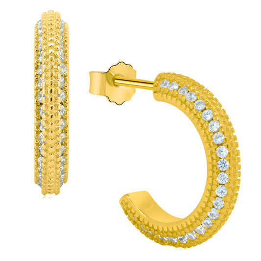 925 Sterling Silver Half Hoops with Multi Cubic Zirconia in the Side Design Earring Push Backing
