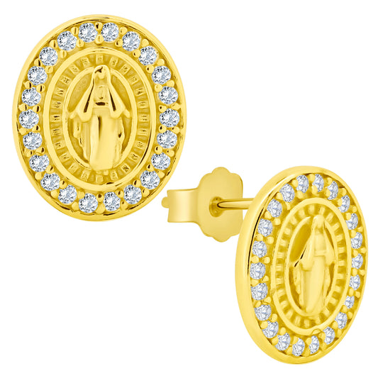 925 Sterling Silver Oval Shape Virgin Mary with Clear Cubic Zirconia Design Earring Push Backing