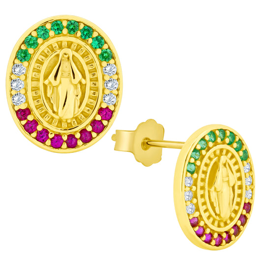 925 Sterling Silver Oval Shape Virgin Mary with Mexican Color Flag Cubic Zirconia Design Push Backing