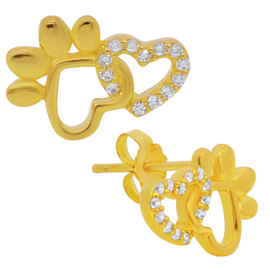 925 Sterling Silver Linking Heart Shaped Paw and Heart Design with Cubic Zirconia Earrings Stud Push Backing