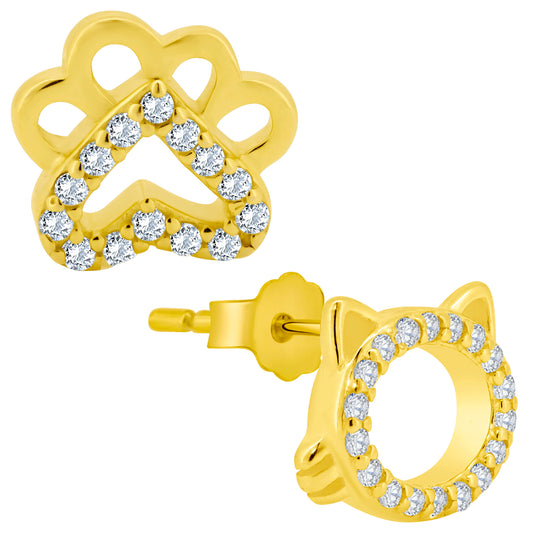 925 Sterling Silver Cat Head and Paw Mismatched with Cubic Zirconia Earrings Stud Push Backing