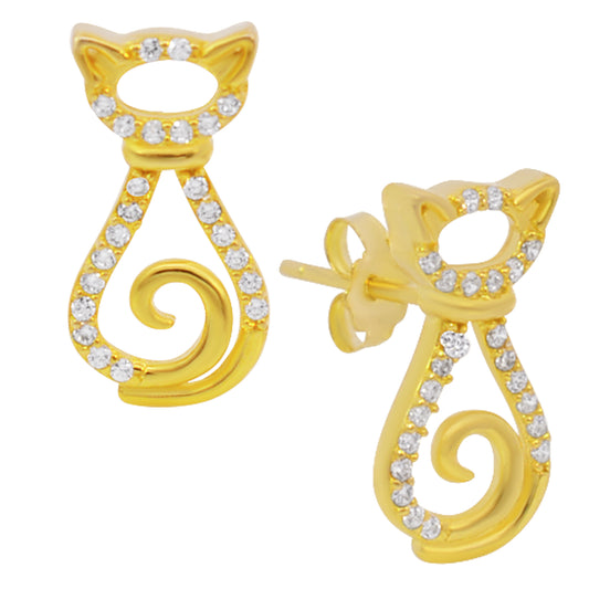 925 Sterling Silver Cat with Cubic Zirconia Earrings Stud Push Backing