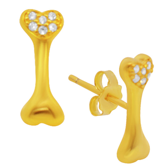925 Sterling Silver Dog Bone with Heart with Cubic Zirconia Earrings Stud Push Backing