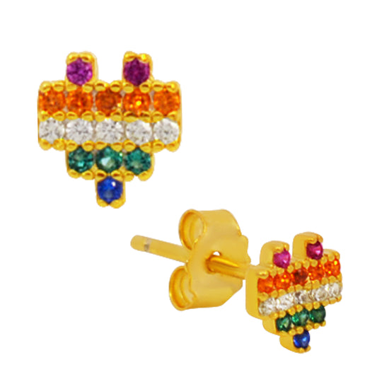 925 Sterling Silver Pixelated Heart with Multi Colored Cubic Zirconia Earrings Stud Push Backing
