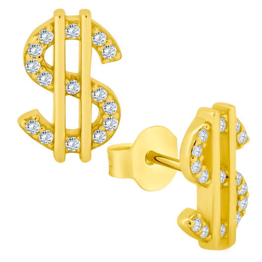 925 Sterling Silver Dollar Sign Design with Cubic Zirconia Earring Push Backing