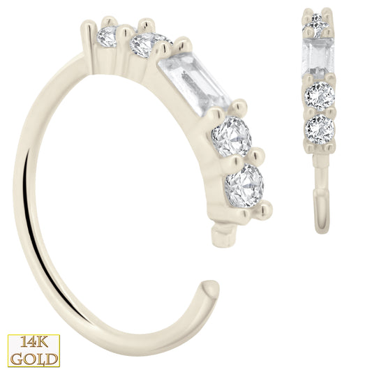 14K Solid Yellow Gold Baguette & Round Shaped GH/VS1 Natural Diamonds Hoop Piercing