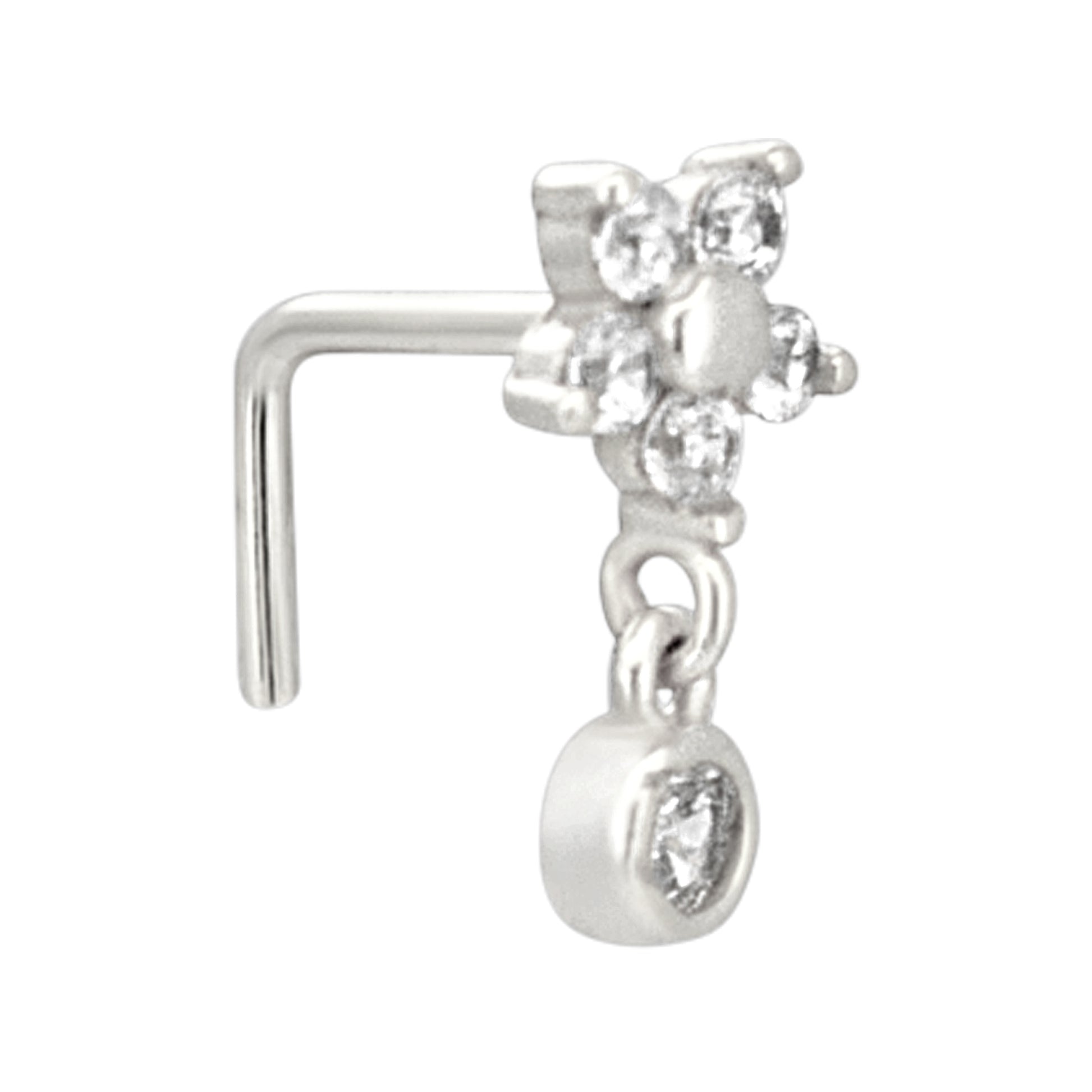 Sterling Silver Five Petal Flower Dangling CZ L-Shaped Nose Ring