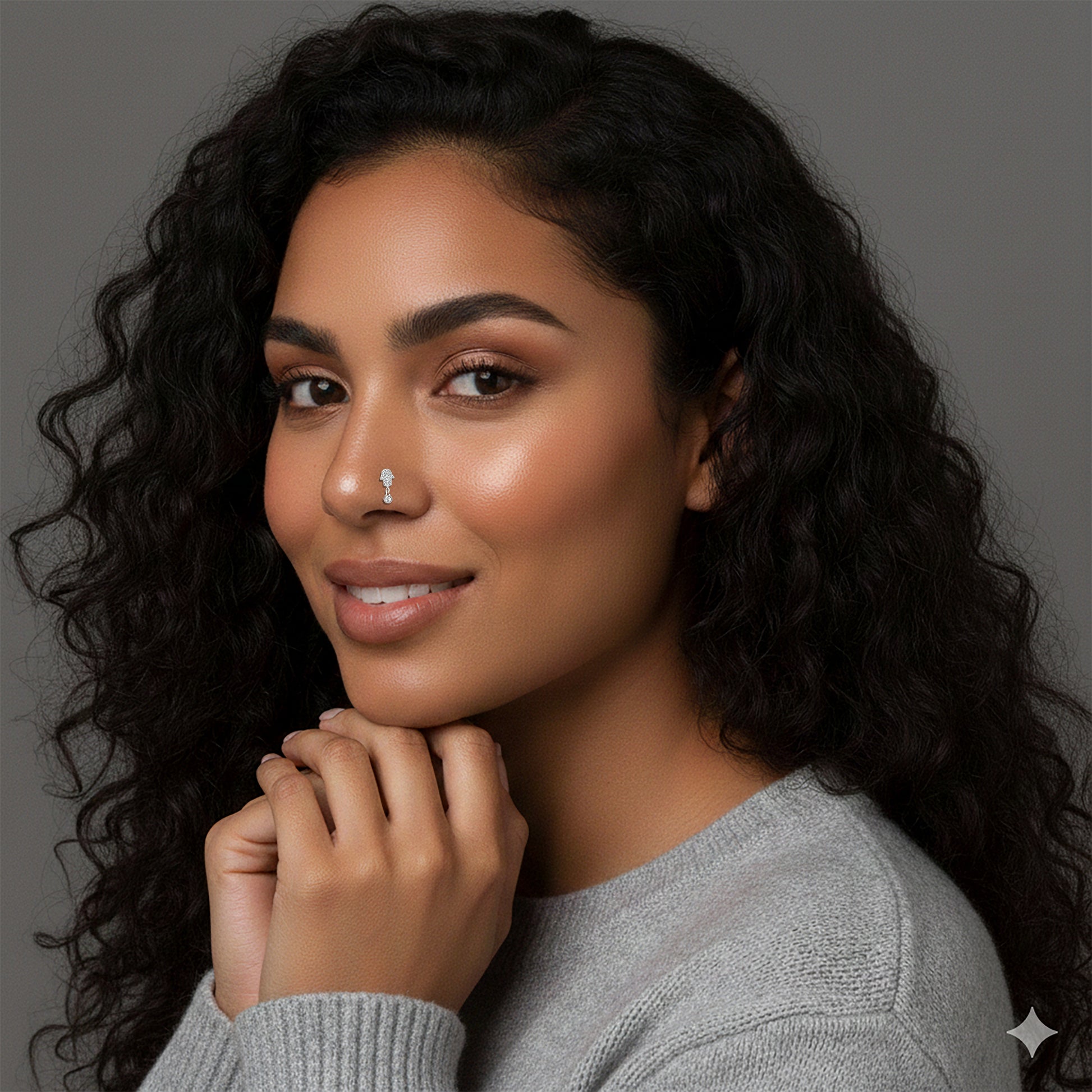 Bring a touch of spiritual elegance to your look with this beautifully crafted Sterling Silver Hamsa Hand Nose Ring, complete with a shimmering dangling Cubic Zirconia charm that catches the light with every movement. The Hamsa — a symbol of protection, good fortune, and positive energy — makes this piece both meaningful and stylish.